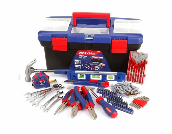 - Инструменты в комплекте: длинногубцы, ключи гаечные, молоток, ножовка по дереву, ножовка по металлу, отвёртки, отвёртки для точных работ, плоскогубцы